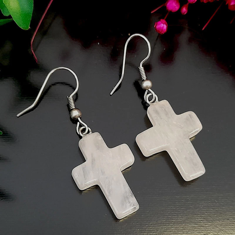 Par de brincos, em pedra lapidada de Cristal, em formato de cruz e ganchos de metal.