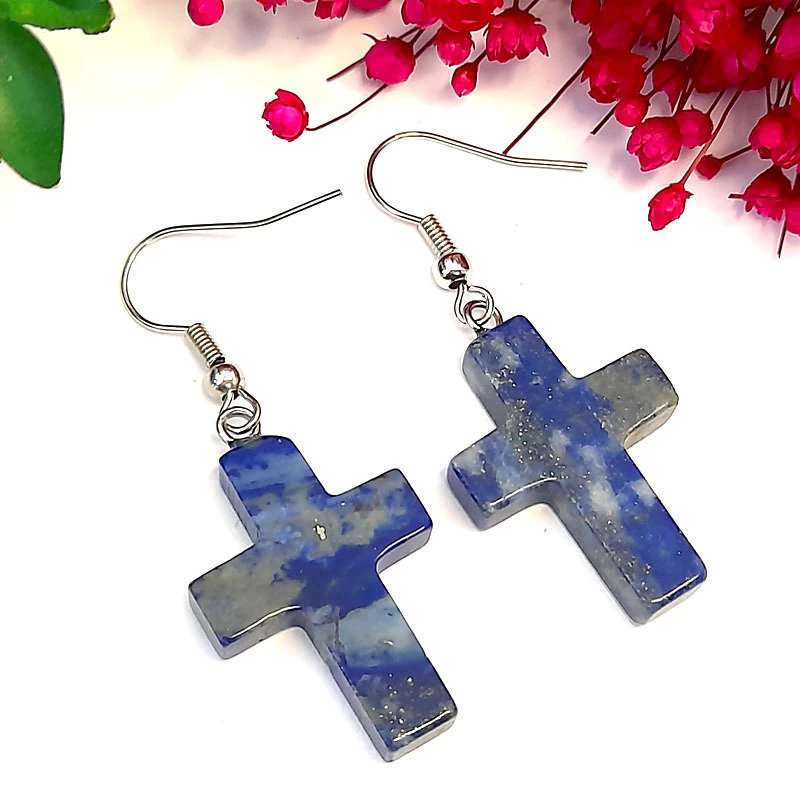 Par de brincos, em pedra lapidada de Quartzo Rosa, em formato de cruz e ganchos de metal.