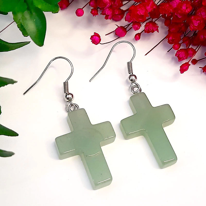 Par de brincos, em pedra lapidada de Quartzo verde, em formato de cruz e ganchos de metal.