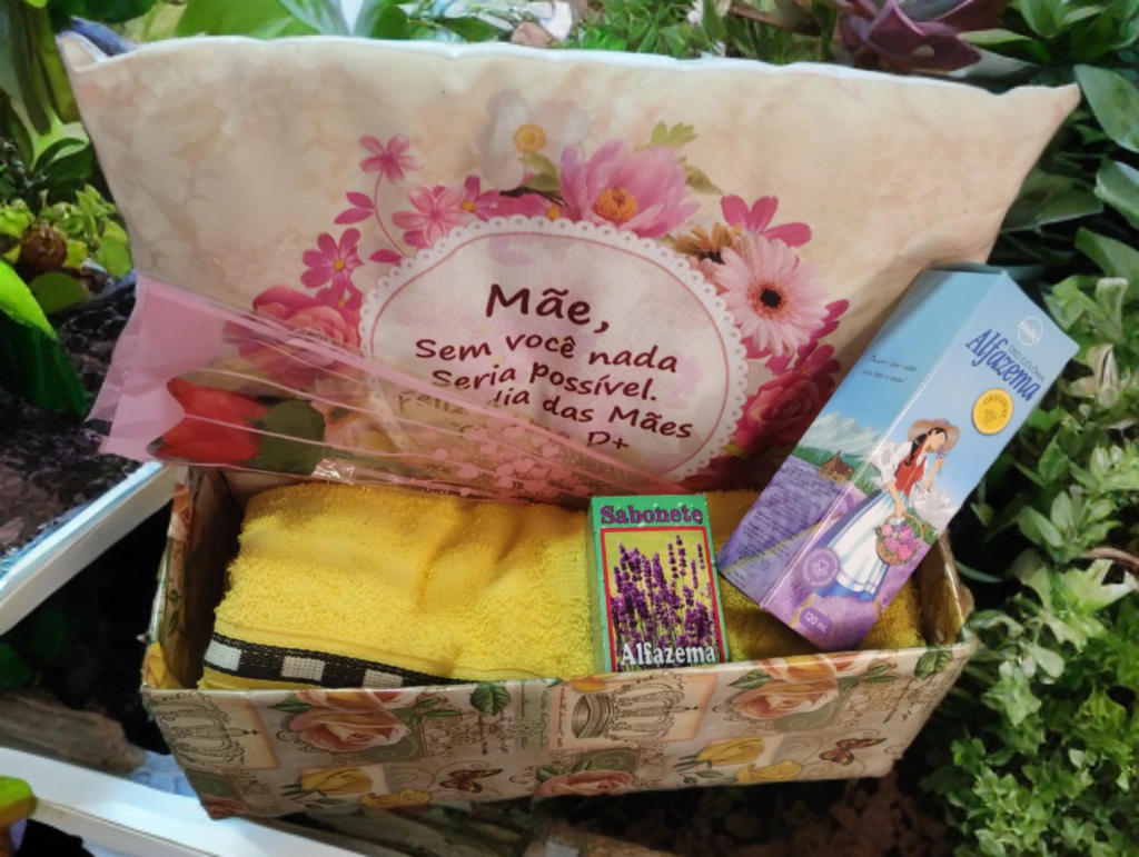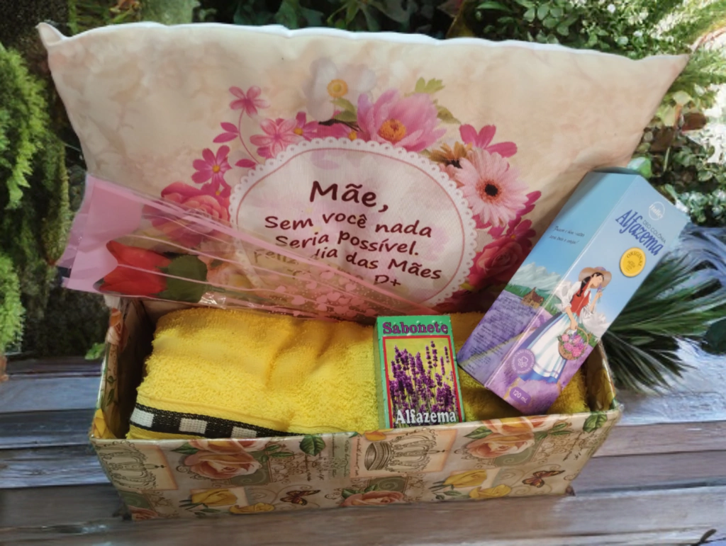 Neste lindo e tradicional kit acompanha: 1 caixa presente decorada, 1 kit tradicional e original de Alfazema composto por 1 colônia de 120ml e 1 sabonete em barra de 50g, 1 toalha de banho grande, 1 Rosa Vermelha e 1 almofada travesseiro grande personalizada com o tema Dia das Mães.