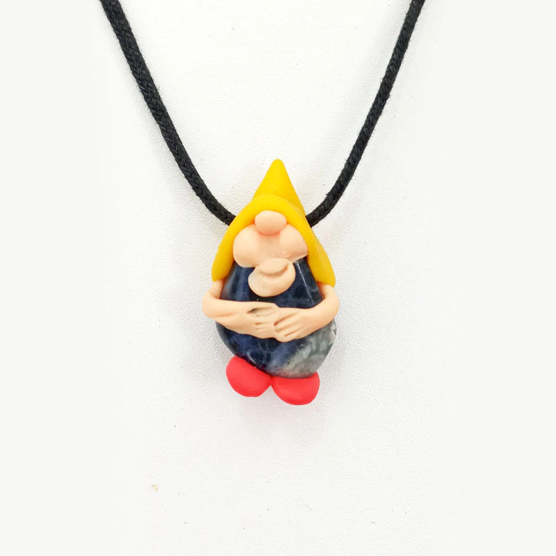Colar com pingente em figura de duende, confeccionado em massa de biscuit, pintado à mão artesanalmente e com pedra rolada de sodalita.