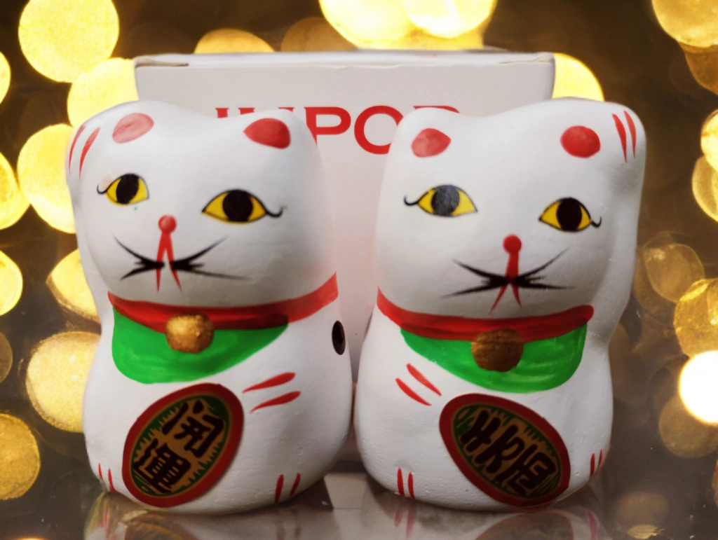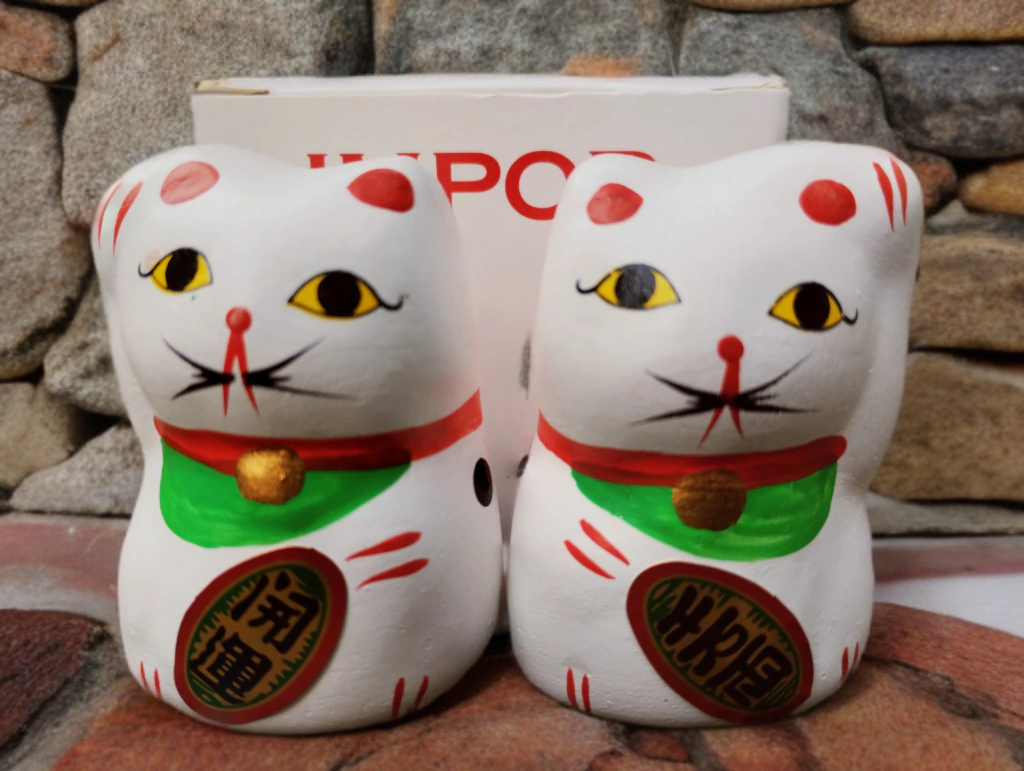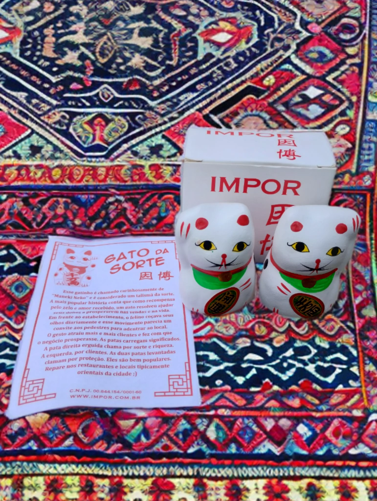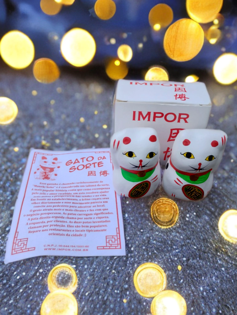 História do Gato da Sorte: Esse gatinho é chamado carionhosamente de "Maneki Neko" e é considerado um talismã da sorte. A mais popular história conta que como recompensa pelo zelo e amor recebido, um gato resolveu ajudar seus donos a prosperarem nas vendas e na vida. Em frente ao estabelecimento, o felino coçava seus olhos diariamente e esse movimento parecia um convite aos pedestres para adrentar ao local. O gesto atraiu mais e mais clientes e fez com que o negócio prosperasse. As patas carregam significados. A pata direita erguida chama por sorte e riqueza, a esquerda por clientes e prosperidade nos negócios; as duas patas levantadas chamam por proteção, sorte e fortuna.