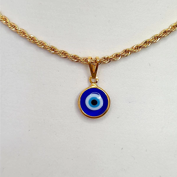Colar em metal dourado trançado, com pingente em figura olho grego na cor azul escura.