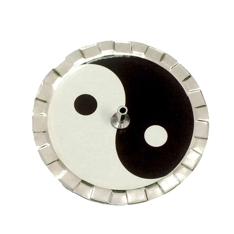 Incensários confeccionados em discos de flandres, material laminado estanhado composto por ferro e aço de baixo teor de carbono revestido com estanho, com adesivos temáticos em Feng Shui, nas figuras das seguintes imagens: