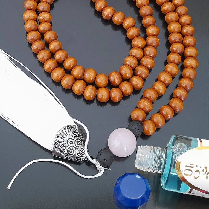 Japamala de 108 contas de madeira marrom clara com pedra rolada vulcânica e pedra natural rolada em formato esférico de Quartzo Rosa.