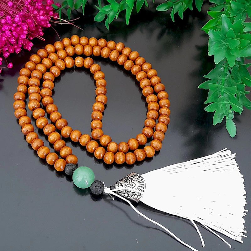 Japamala de 108 contas de madeira marrom clara com pedra rolada vulcânica e pedra natural rolada em formato esférico de Quartzo Verde.