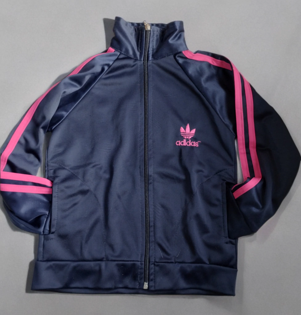 Jaqueta da Adidas infantil tamanho 8. A jaqueta tem bolsos laterais e fecho de zíper. Cor: azul marinho com listras e símbolos rosas.