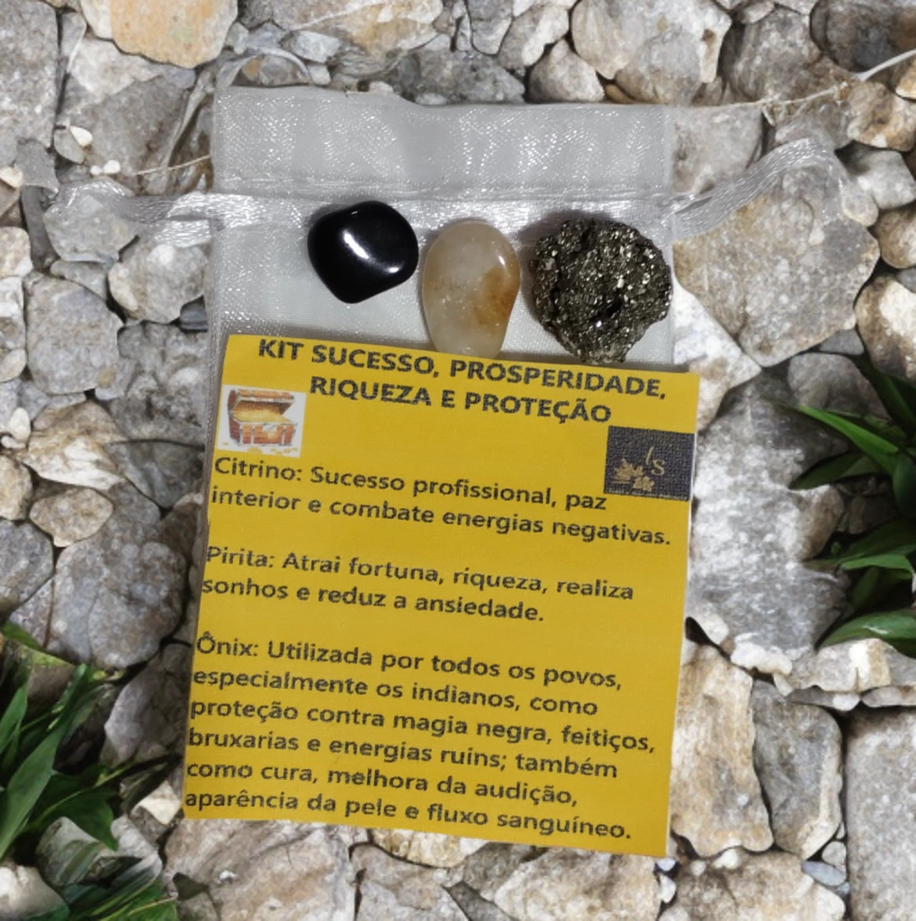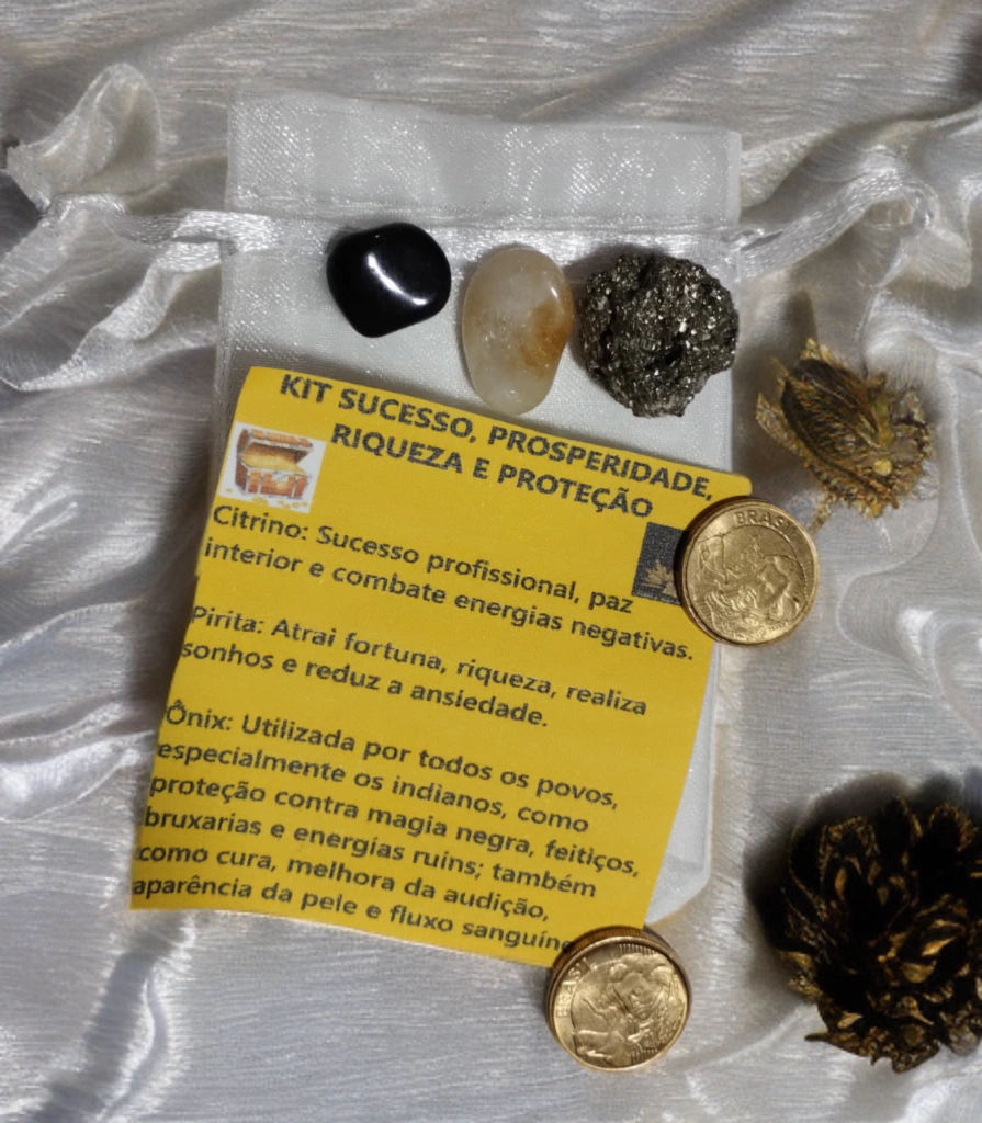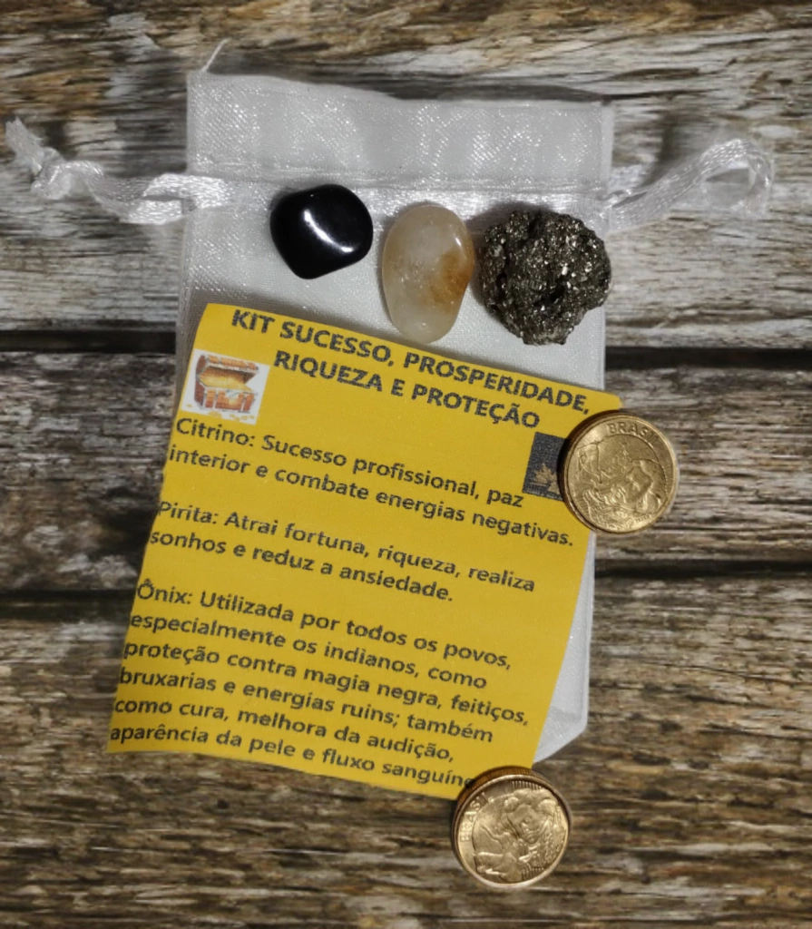 Nesse kit acompanha 1 Citrino Queimado, 1 Pirita, 1 Ônix, 1 saquinho de organanza e 1 panfleto explicativo.