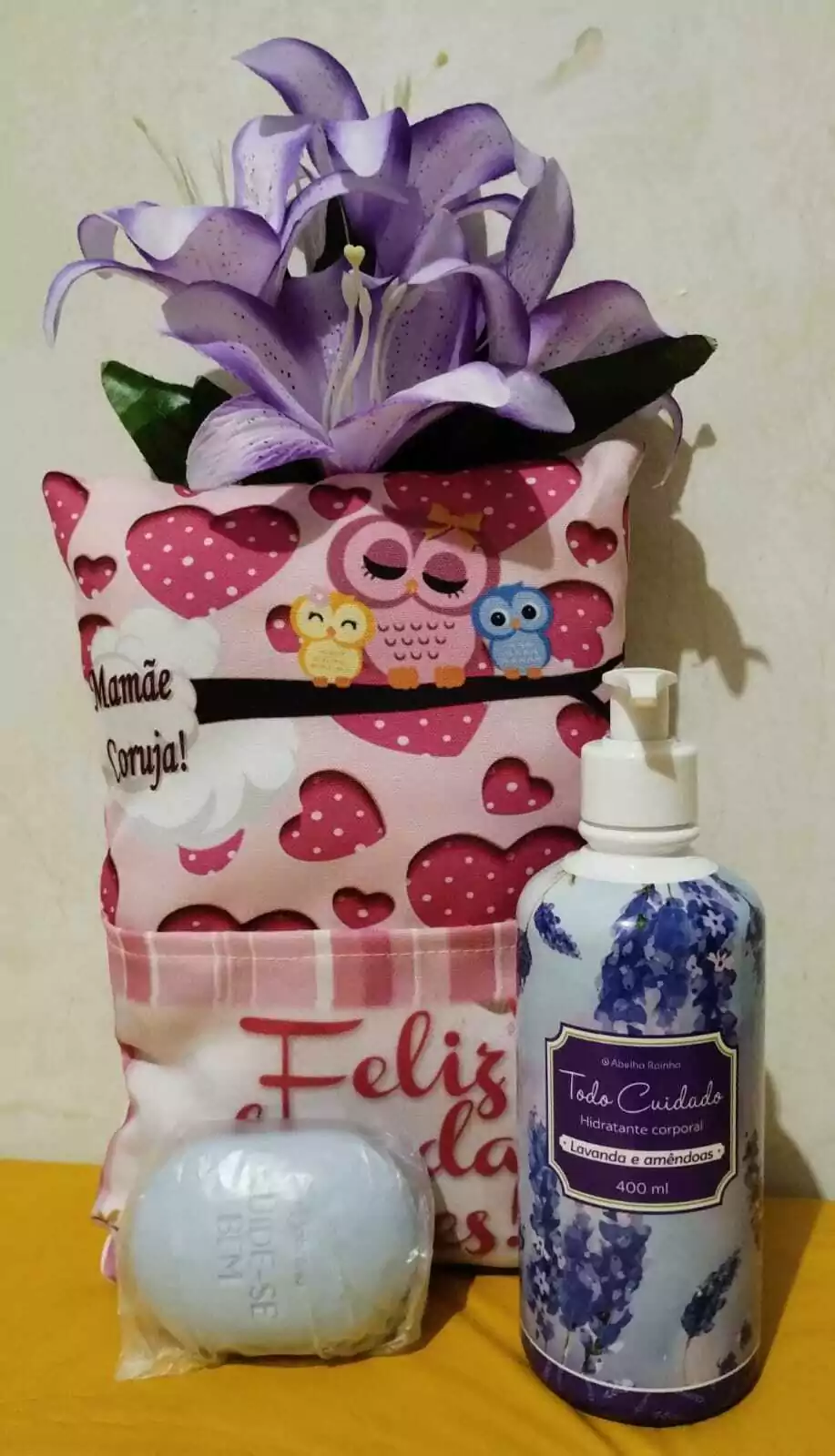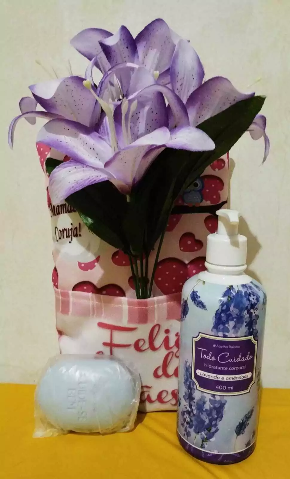 Esse kit é muito lindo e perfeito! Pois acompanha 1 almofada decorativa e útil de dia das mães, 1 buquê de lírios lilases (toda mulher e mãe gostam de flores), 1 hidratante corporal 400ml Lavanda e Amêndoas da linha Todo Cuidado da Abelha Rainha e 1 sabonete em barra Lavandinha da linha Cuide-se Bem da O Boticário.