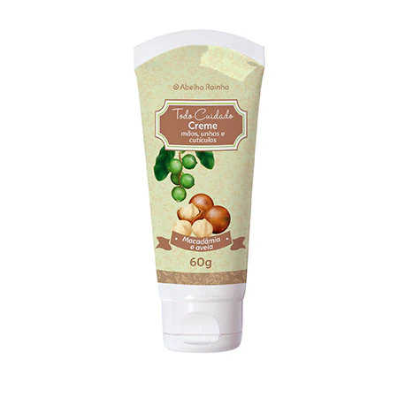 Hidratante corporal 400ml e hidratante para as mãos 60g: ambos são de macadâmia e aveia e pertencem a linha Todo Cuidado da Abelha Rainha. Todos os benenfícios da macadâmia e da aveia em um único produto!