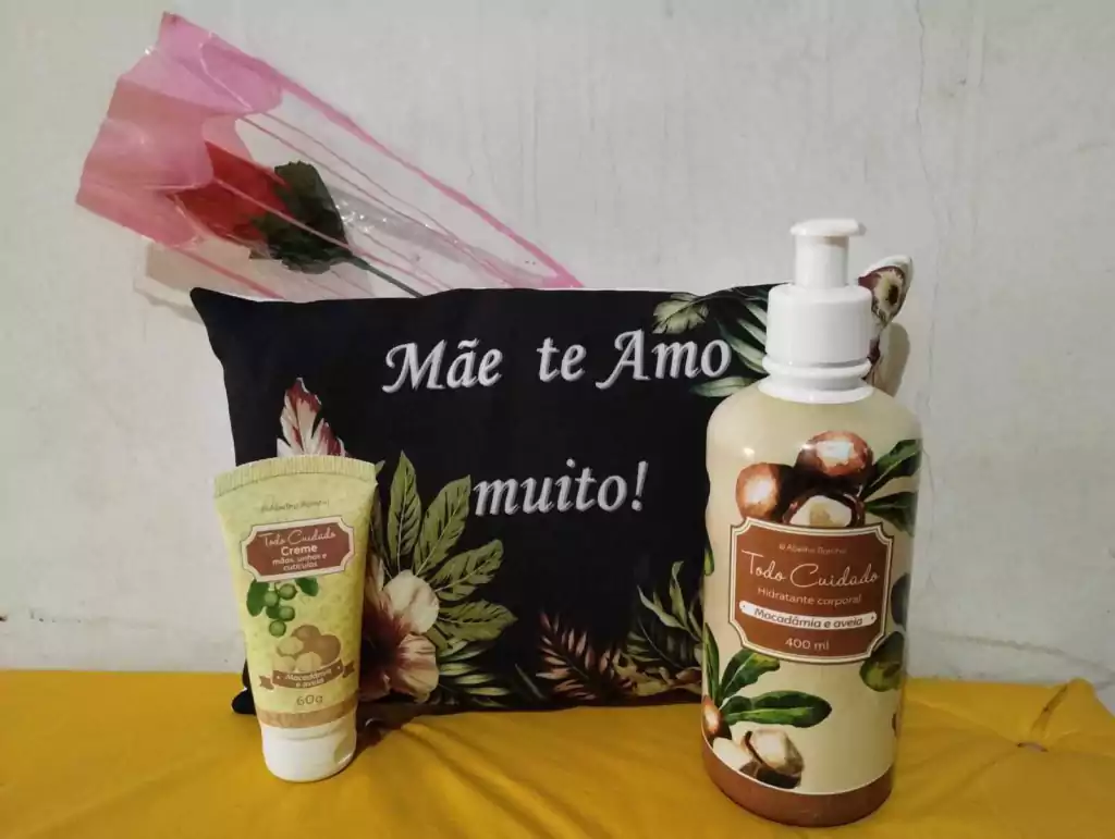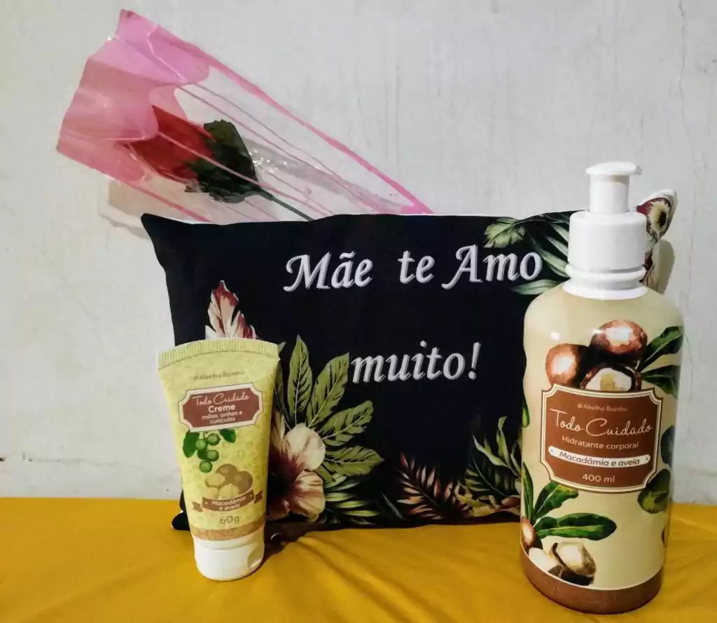 Neste kit acompanha 1 almofada dia das mães, 1 rosa vermelha com emabalagem decorada, 1 hidratante corporal e 1 hidratante para as mãos (ambos os hidratantes da mesma fragrância que é macadâmia e aveia.