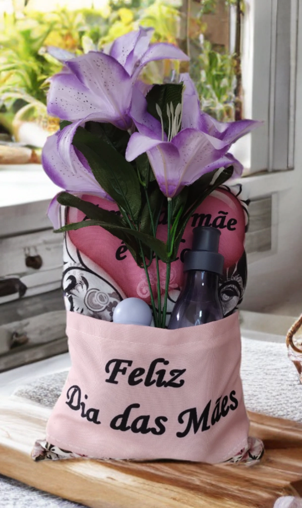 Tudo em resumo que acompanha o kit: 1 almofada com bolso, 1 body splash de algodão, 1 colônia Mamãe e Bebê, 1 buquê de lírios.