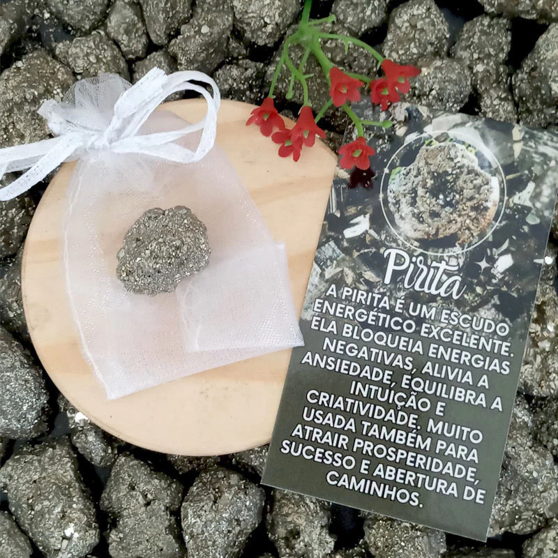 Kit com uma pedra rolada/bruta de Pirita, cartão informativo e saquinho de organza para proteger sua pedra.