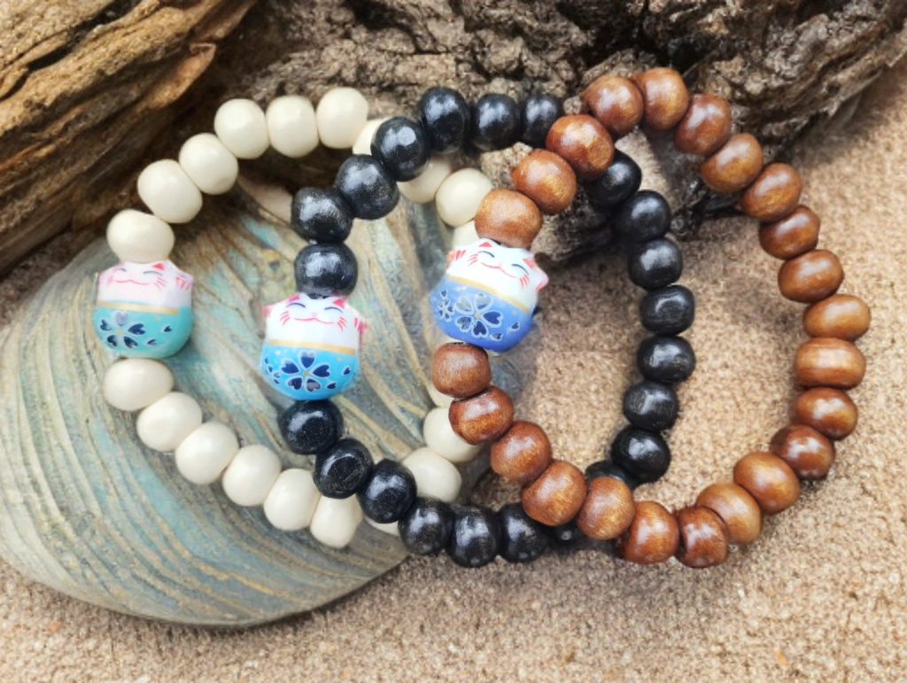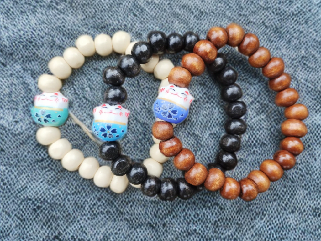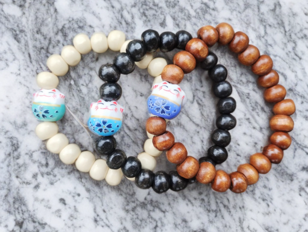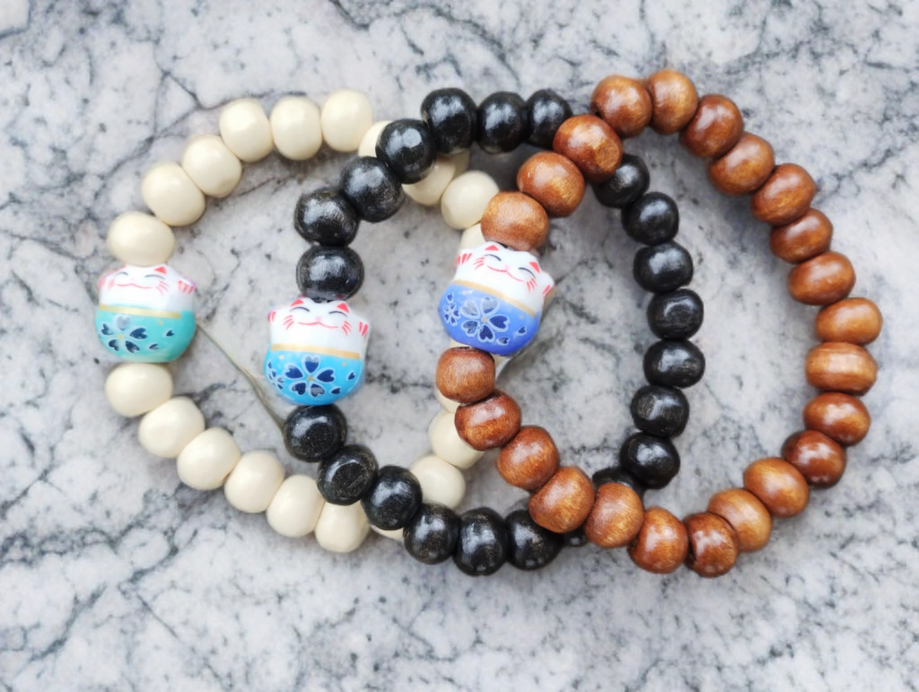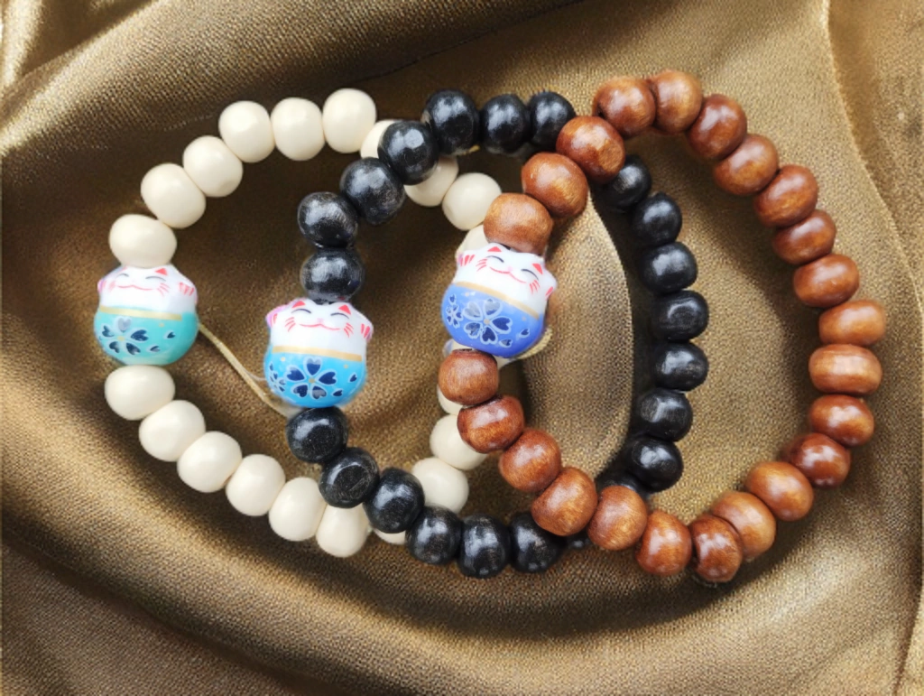 Use o seu japamala em pulseira com Gato da Sorte Maneki Neko sempre. Produto importado, original e duradouro, feito em madeira.